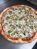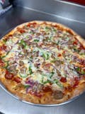 Green peppers, onions, black olives, ham, sausage, mushrooms, meatballs & pepperoni.
