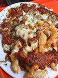 Marinara Sauce, Penne Pasta, Meatball, Sausage, Ricotta cheese, Parmesan cheese and Mozzarella cheese